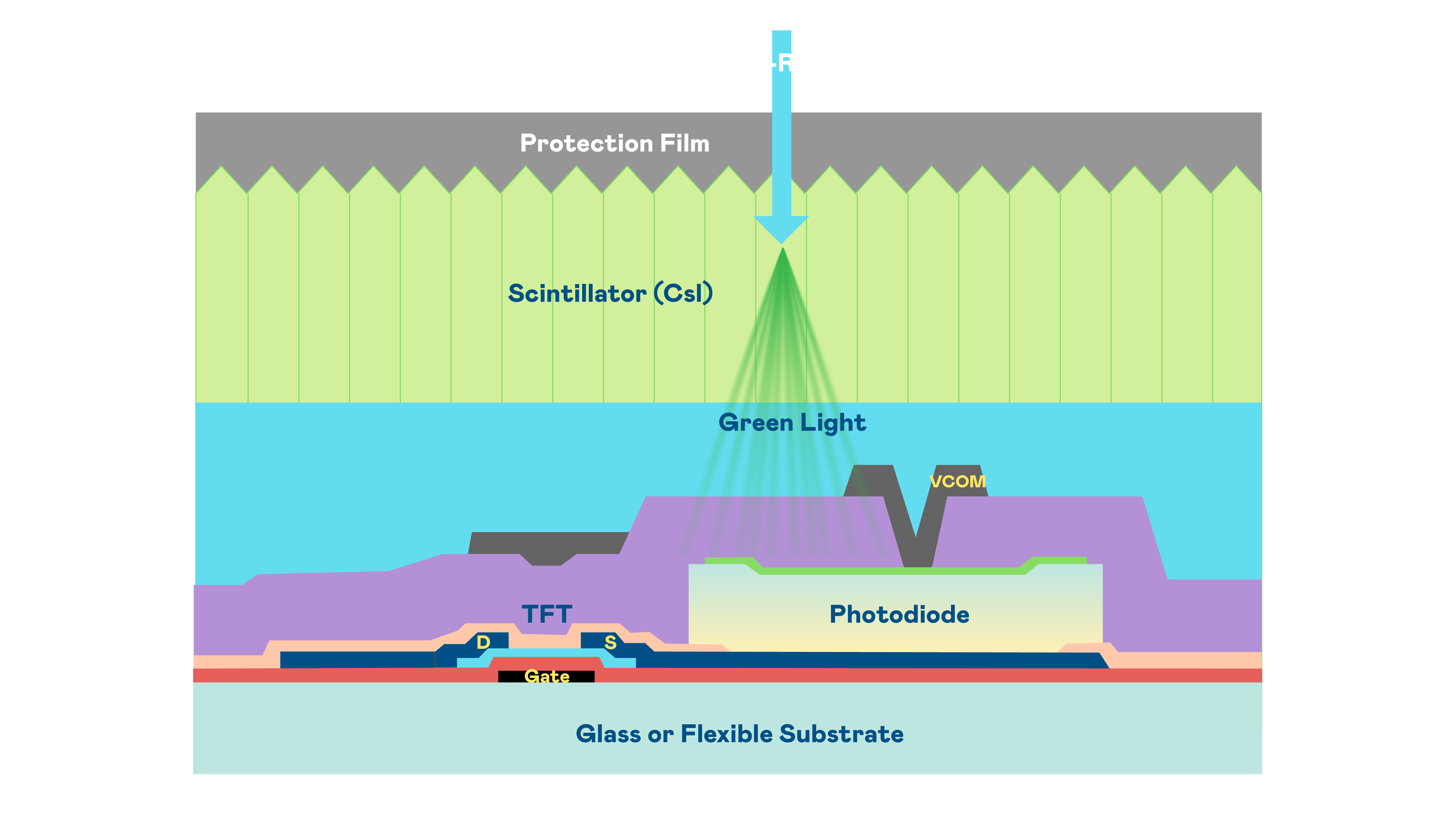 金世豪的X光影像感测阵列使用薄膜电晶体 (TFT) 作为每个像素的读取开关,搭配光电二极体(Photodiode)的光电转换元件,用以感测X光影像讯号。
